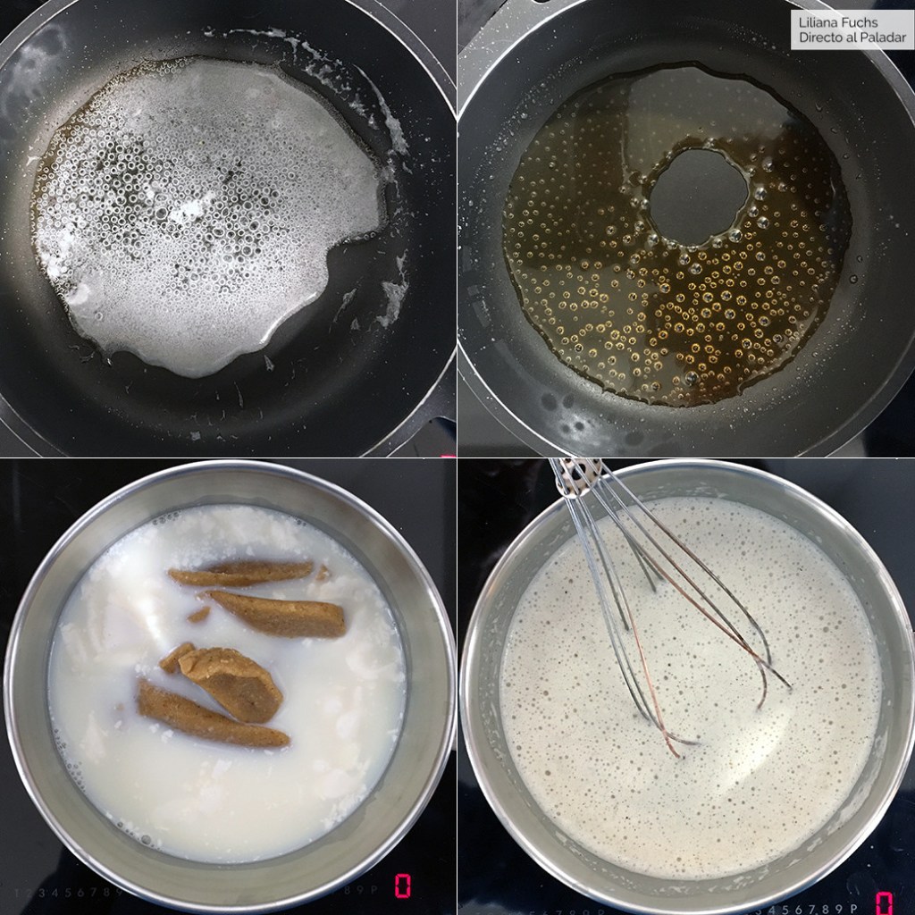 Para hacer el caramelo, pon a calentar una sartén a fuego fuerte con 80 gramos de azúcar. Cuando empiece a tomar color baja el fuego y mantenlo hasta que se dore un poco (ni muy rubio, ni muy tostado). Cuando se funda, remueve y cubre el fondo de los moldes.